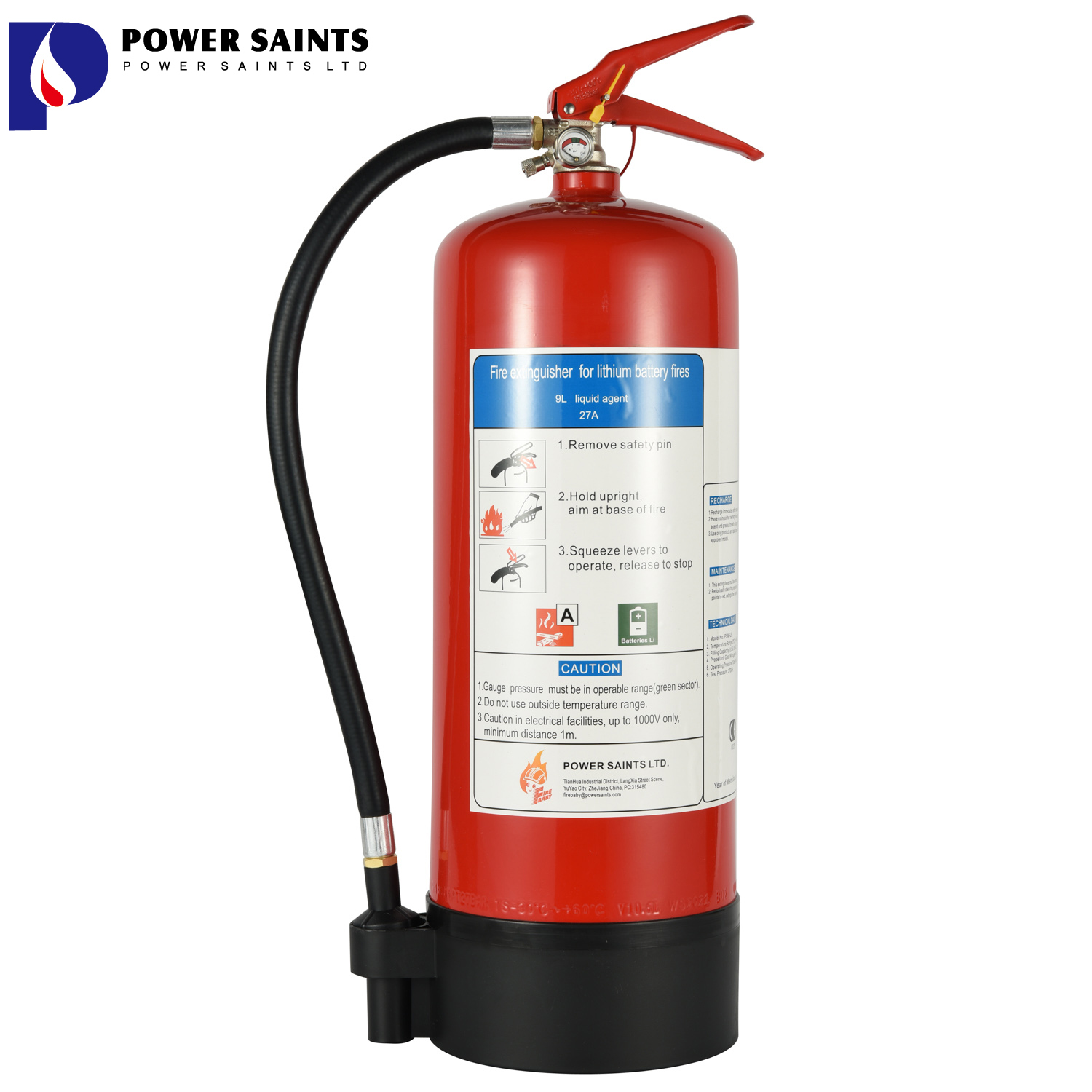 BS EN3 / KIWA Lithium ion Battery Fire Extinguisher 9L (PSMFZ9L)